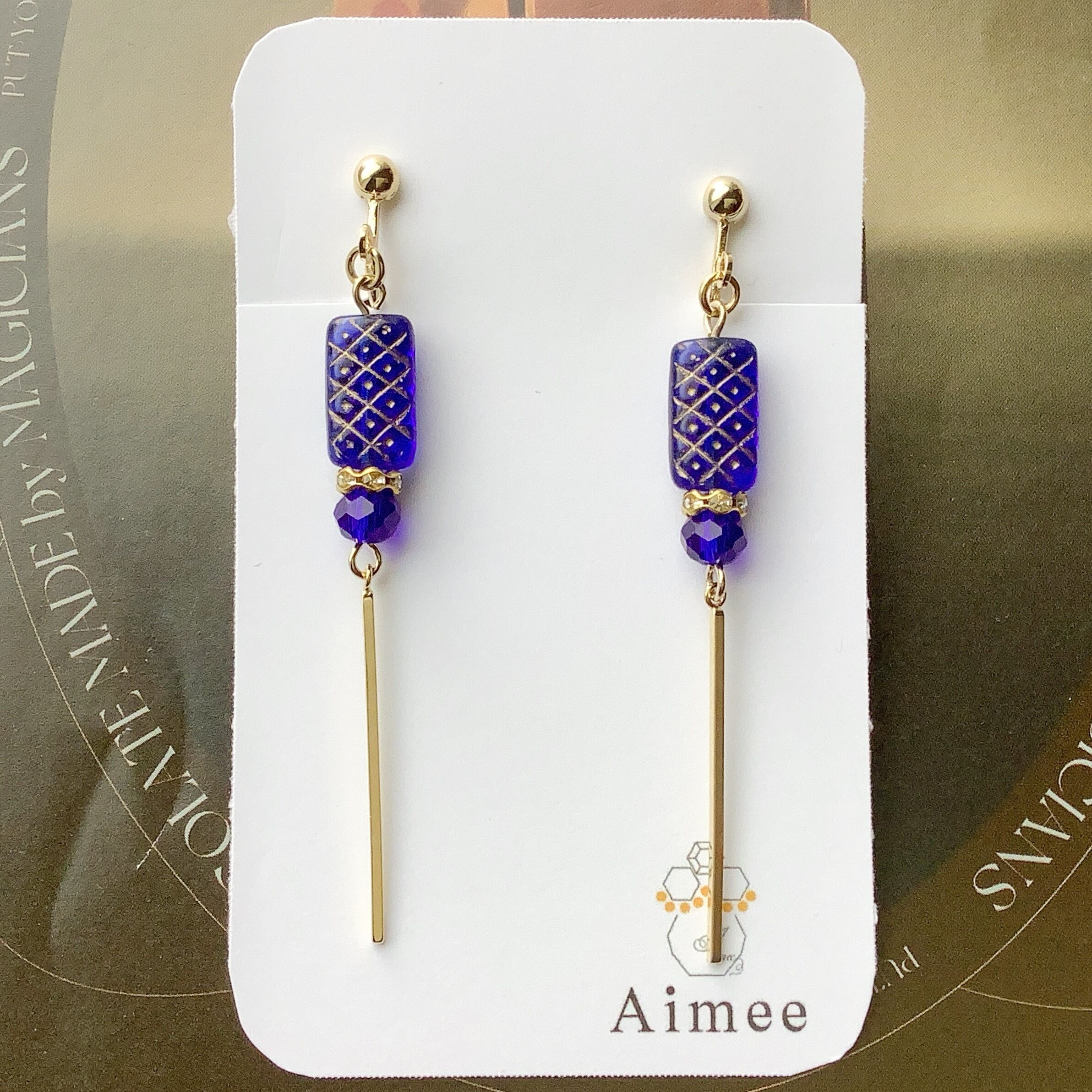チェコガラス(ブルースクエアボタンカット)×メタルロングバー