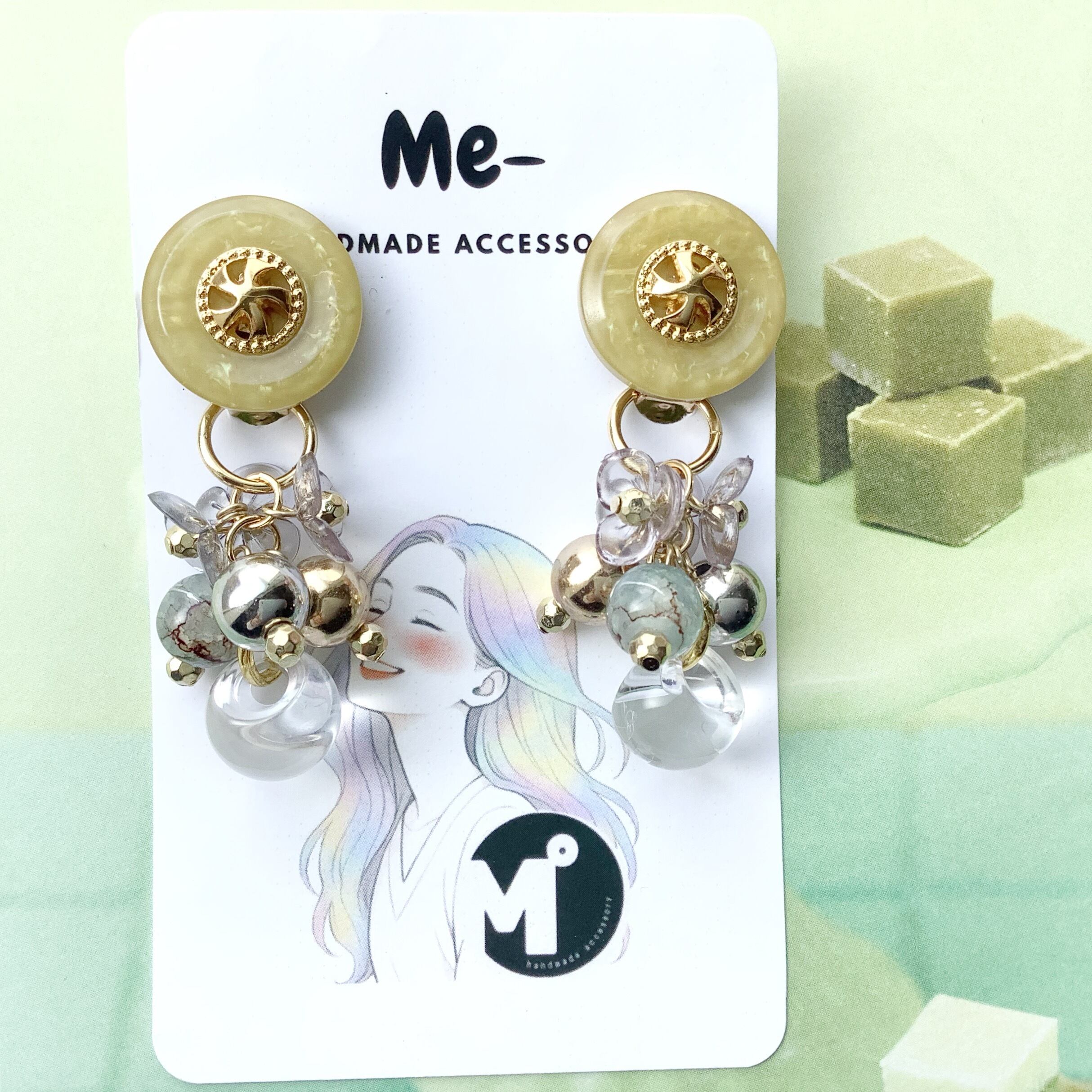 Me- 2wayヴィンテージボタン×お花のじゃらじゃらイヤリング